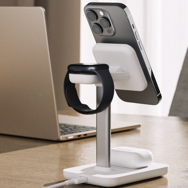 The Rapid TRIO, from the Melbourne-based Apple accessory maker Journey, lets dad wirelessly charge up to three things at once: an iPhone 12, 13 or 14 on the magnetic-docking MagSafe charger at the top; a pair of wirelessly chargeable earbuds, or indeed a second, wirelessly chargeable phone, on the “Qi” charger under it; and an Apple Watch on the back.