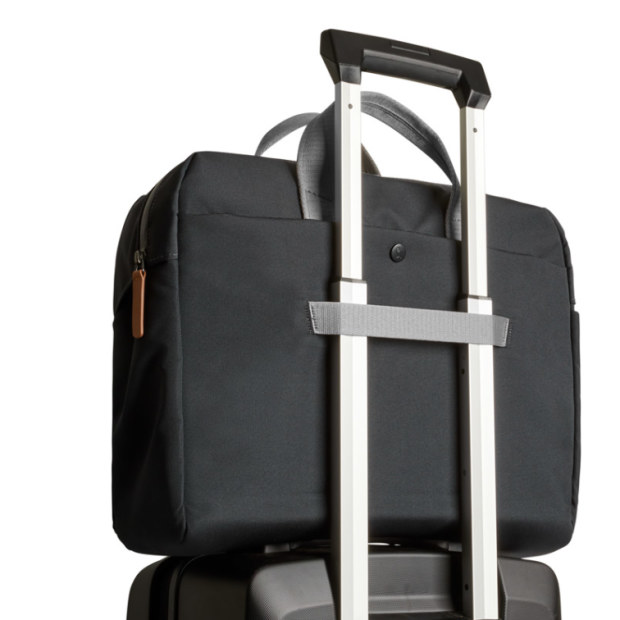 The Work Bag slides onto a suitcase handle. Bonus!